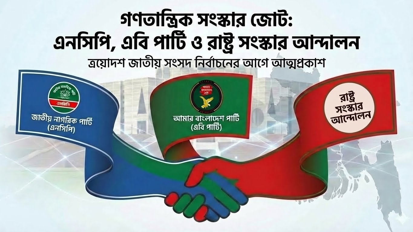 আসন্ন ত্রয়োদশ জাতীয় সংসদ নির্বাচনকে সামনে রেখে আত্মপ্রকাশ করল নতুন রাজনৈতিক মোর্চা ‘গণতান্ত্রিক সংস্কার জোট’। জাতীয় নাগরিক পার্টি (এনসিপি), আমার বাংলাদেশ পার্টি (এবি পার্টি) এবং বাংলাদেশ রাষ্ট্র সংস্কার আন্দোলন—এই তিন দল মিলে এই জোট গঠন করেছে।